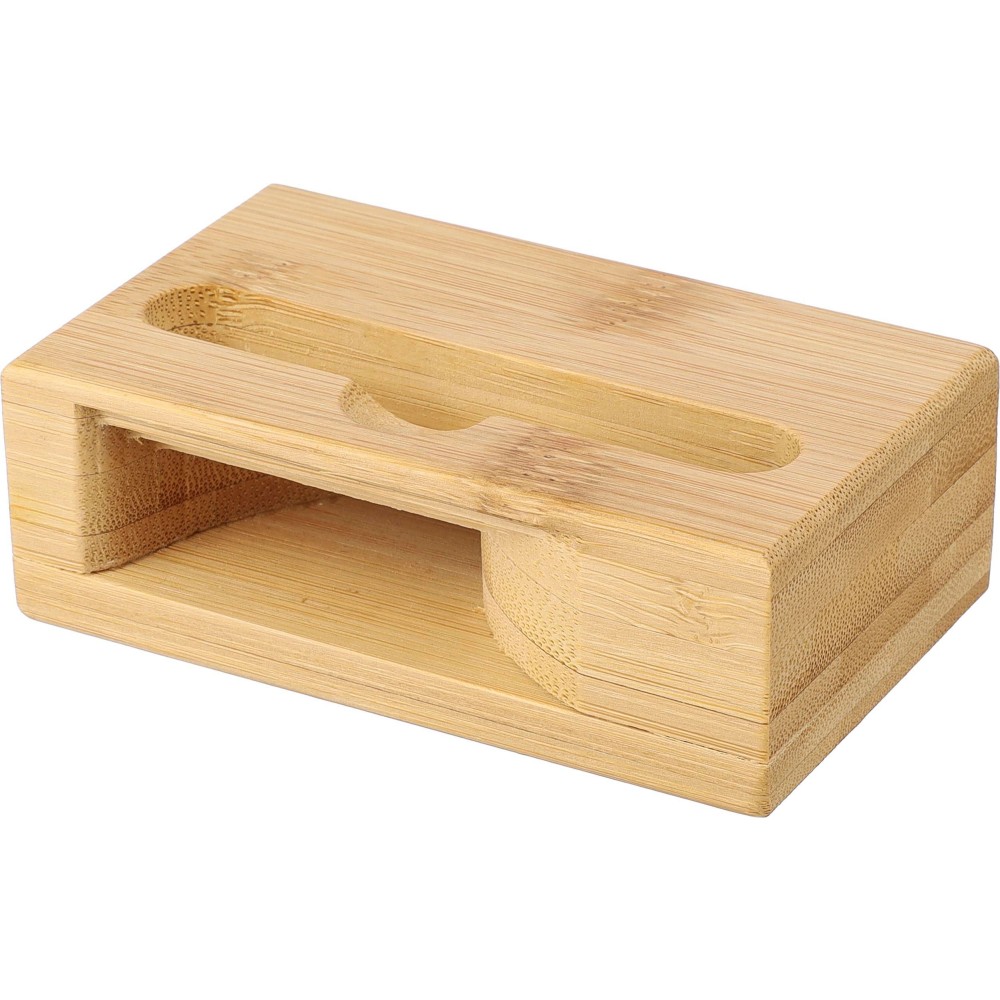 Bambusz telefontartó hangszóró funkcióval. Zenelejátszás közben az alsó részen keresztül erősíti a hangot áram vagy elem használata nélkül. Telefontartó nyílás méretei: kb. 8,2 x 1,2 cm. Egyenként barna kartondobozba csomagolva.