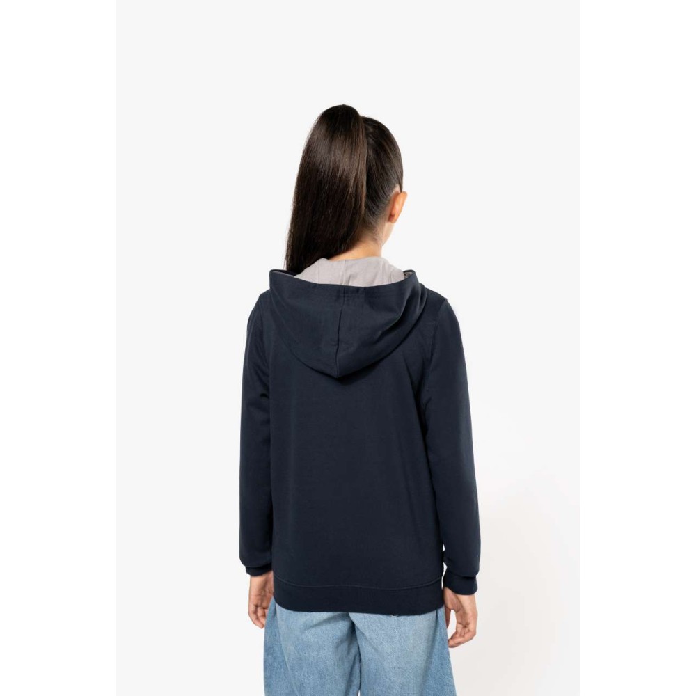 80% pamut és 20% poliészter anyag. Sima polár anyag, bordés ujj- és aljpasszé. Kontrasztos színű, bélelt kapucni.Fülhallgató számára kivezető nyílás a kanguru zsebből és a nyaknál. 280 g/m2. 6/8-12/14 éves méretig.