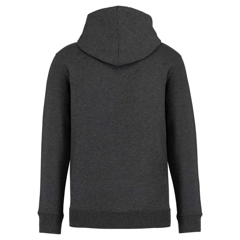85 % bio, fésült pamutból és 15 % újrahasznosított poliészterből készült. Unisex. Egyenes szabás. Méretcímke organikus pamut és újrahasznosított poliészter logóval. LSF (Low Shrinkage Fleece: előzsugorított polár) kezelés. Kapucni. 1x1 bordás szegély és kézelő. Duplatűzés a kézelőn, a szegélyen és a nyaknál. Szalagozott nyakbelső hátul. Bélelt kapucni, a nyaknyíláson nincs felülvarrás, csak egy megkötés, hogy a húzózsinór a felső részen maradjon. Kerek húzózsinór a kapucnin fém véggel. Kenguru zseb. Nincs márkajelzés a nyakrészen, csak egy méretcímke a könnyű dekorálás érdekében. Karton függőcímkével érkezik, amely felsorolja a termék előállításához felhasznált környezetbarát anyagokat. Organikus pamutfonal. OEKO-TEX N CQ1007/7 STANDARD 100 tanúsítvánnyal rendelkezik. IFTH. 350 g/m2.