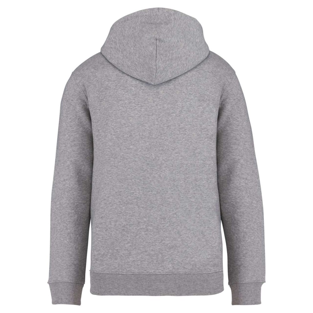 85 % bio, fésült pamutból és 15 % újrahasznosított poliészterből készült. Unisex. Egyenes szabás. Méretcímke organikus pamut és újrahasznosított poliészter logóval. LSF (Low Shrinkage Fleece: előzsugorított polár) kezelés. Kapucni. 1x1 bordás szegély és kézelő. Duplatűzés a kézelőn, a szegélyen és a nyaknál. Szalagozott nyakbelső hátul. Bélelt kapucni, a nyaknyíláson nincs felülvarrás, csak egy megkötés, hogy a húzózsinór a felső részen maradjon. Kerek húzózsinór a kapucnin fém véggel. Kenguru zseb. Nincs márkajelzés a nyakrészen, csak egy méretcímke a könnyű dekorálás érdekében. Karton függőcímkével érkezik, amely felsorolja a termék előállításához felhasznált környezetbarát anyagokat. Organikus pamutfonal. OEKO-TEX N CQ1007/7 STANDARD 100 tanúsítvánnyal rendelkezik. IFTH. 350 g/m2.