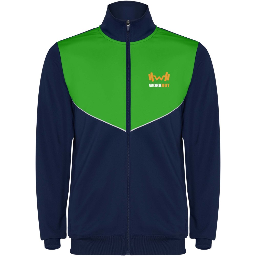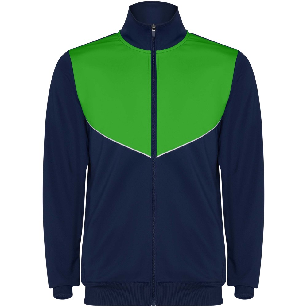 Könnyű és rugalmas anyagból készült melegítő. A végig cipzáros felső kontrasztos színű és varrású díszítésekkel dekorált a mellrészen. Oldalzsebek. Bordázott ujj- és és derékpasszé. Nadrág gumis derékkal és húzózsinórral, kontrasztos oldalsó varrással. Cipzáras szegély.