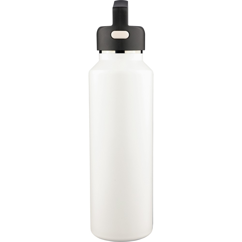 Újrahasznosított rozsdamentes acélból készült, vákuumszigetelésű palack 600 ml űrtartalommal, duplafalú kialakítással, hordozófüllel ellátott PP fedéllel és kétféle (dupla) nyitási lehetőséget biztosító nyomógombos rendszerrel. A palacktesten lézergravírozott recycled (újrahasznosított) alapanyagra utaló logó található. Darabonként barna kartondobozba csomagolva.