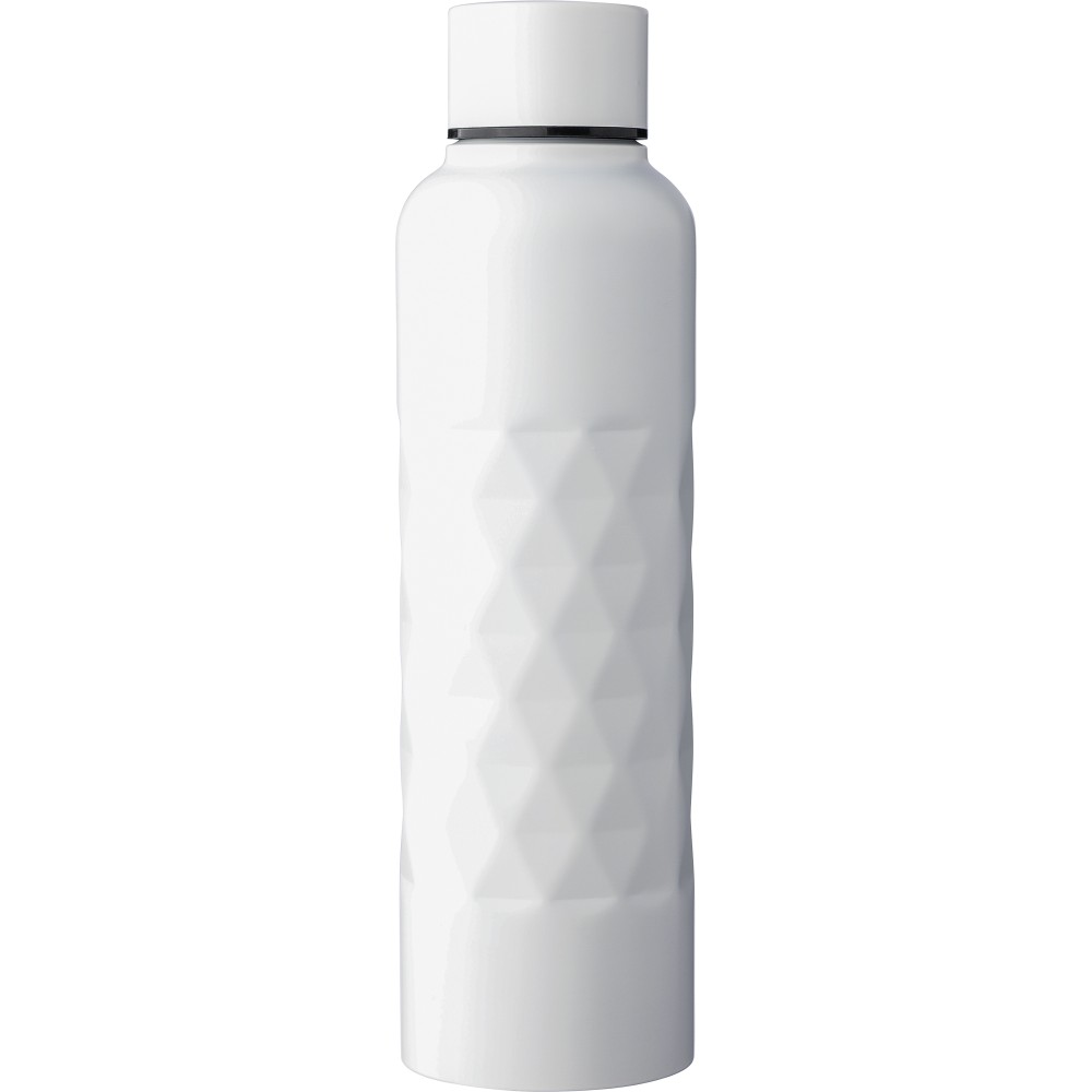 Újrahasznosított 304-es rozsdamentes acélból készült szimplafalú kulacs, 800 ml-es. Gyémánt alakú textúrával a testen, csavaros tetővel és lézergravírozott újrahasznosított logóval. Egyenként csomagolva, barna kartondobozban.